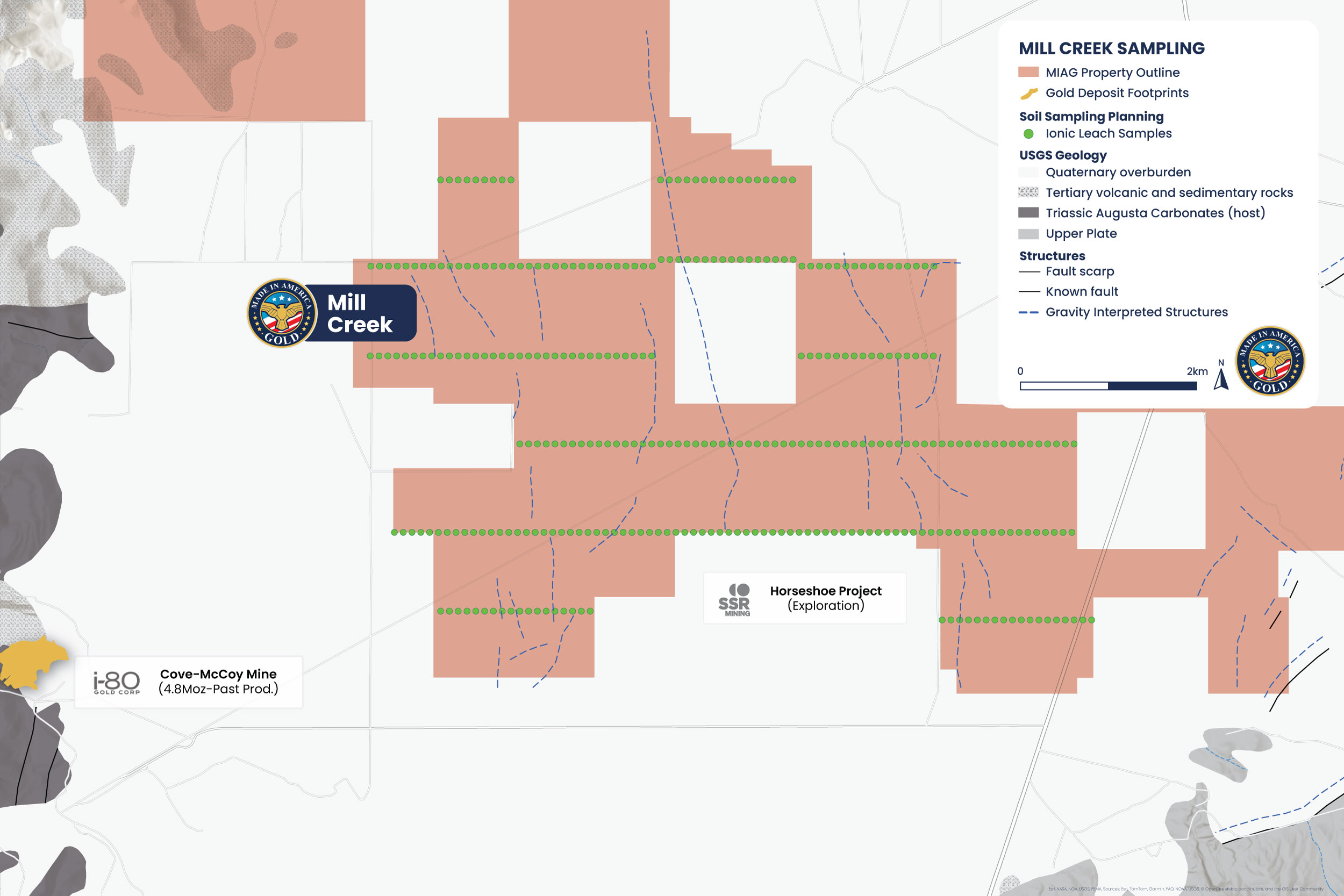 Over 300 samples have been submitted for Ionic Leach™ (“IL”) from the Mill Creek property (Figure 3), located 4 kilometres east of I-80 Gold’s past-producing McCoy-Cove Mine, in an area of thin basin overburden. Developed by ALS Global, the IL technique provides ultra-low-level selective analysis of mobile metal ions to detect subtle geochemical halos above buried mineral systems. Mill Creek was staked in 2020 based on past exploration activity and regional public gravity data indicating a basement high, interpreted as a favourable structural and lithologic setting for Carlin-type gold mineralization.